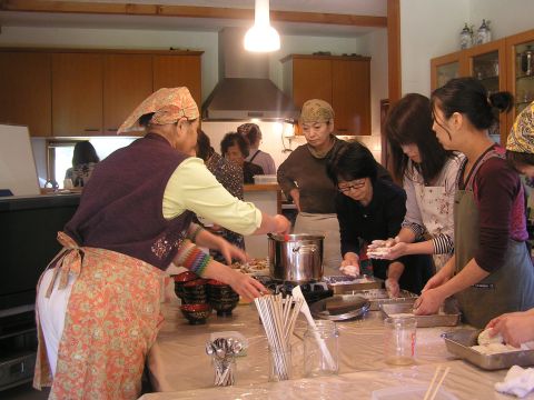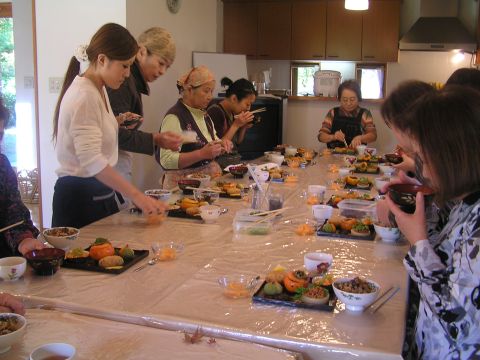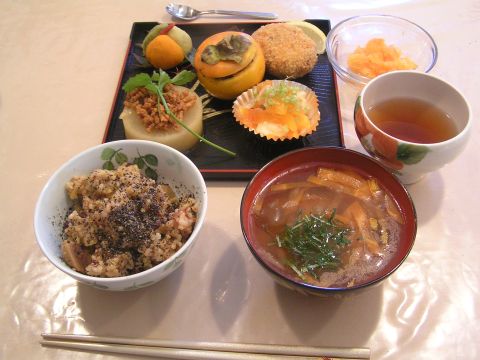 小豆入りクリご飯・吉野汁・雑穀コロッケ・ひじきとレンコン柿がま・かきなます・ふろふき大根の肉味噌だれ・変わり三色茶巾でした。いつもの事ながら行く度に成程そうか・・・こうすればいいのか・・・。とヒントを頂いています。