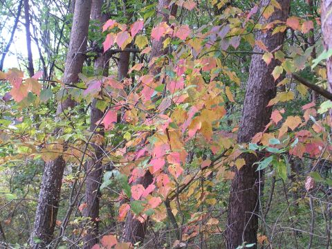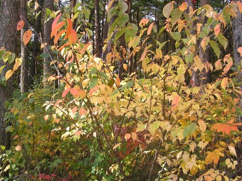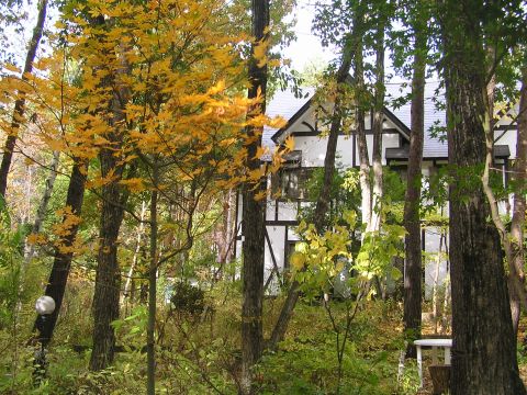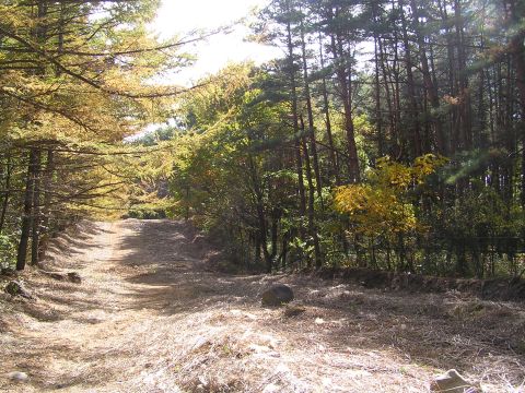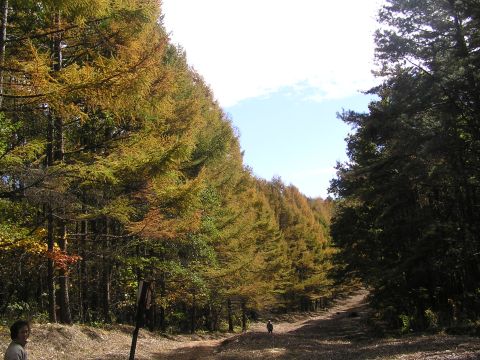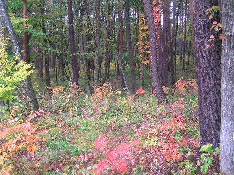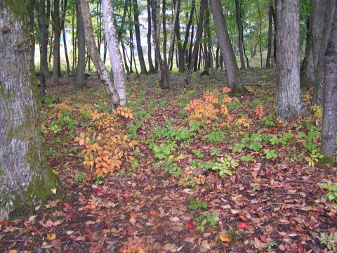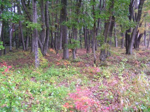 朝から久し振りの雨で木々も喜んでいるようです。林の中へ入ってみました。下刈りが綺麗にされていて歩きやすく、見通しがよく、刈られた後で伸びてきた木々が足元で紅葉していて何ともいえない独特の雰囲気をかもし出しています。傘をさしたまま暫く立ち尽くしていました。