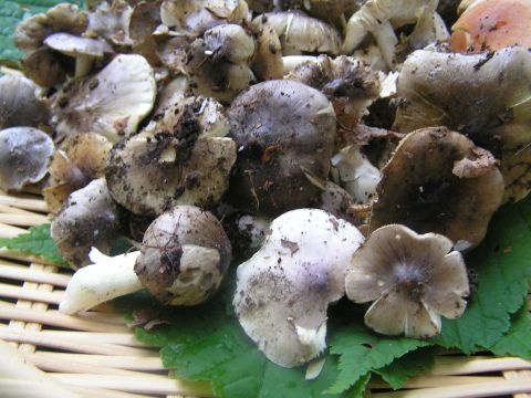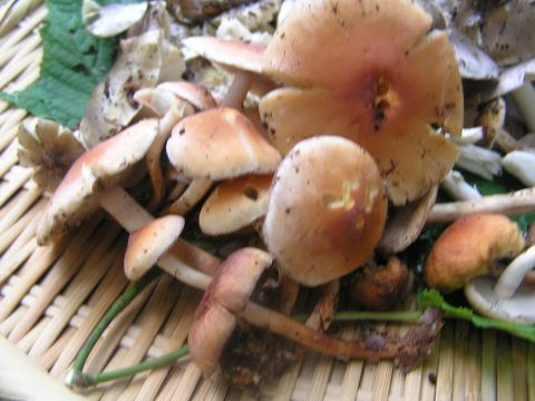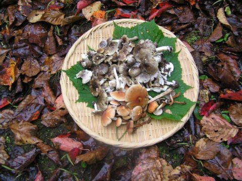 雨上がりの湿った林に入ってみました。目を凝らしてみるとあった!!落ち葉をかぶってちょこっとかさがみえています。足が取れないようにそっと抜きます。中には大きなものが4本もくっついているものも・・。このキノコは一番美味しいといわれています。いろいろな人が入っている林もそれぞれ目線が違うのですね。茶色っぽいものはクリたけです。これは少し前までは大きな塊で採れましたが今はもう1本2本が採れるくらいです。1時間ほどの散策でこれだけ採れて楽しませてもらいました。
