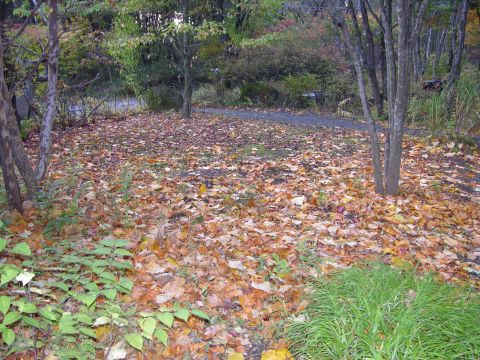 このところ毎日毎日ユリの木の大きな葉が舞い落ちています。一面に折り重なり歩くとからからと乾いた音が・・・・。落ち葉は掃かないほうが山野草の種が留まるとのことなので、今年からは其の儘にすることにしましたので・・・楽・楽・楽・です。昨年までは落ち葉掃除に4,5日はかかりましたもの・・・・。