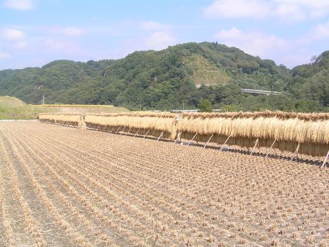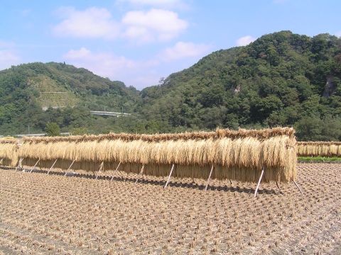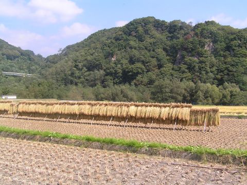 買い物帰り黄金色に輝いていた田んぼの一部が刈り取られて整然と干されていました。昔ながらの自然乾燥でさぞかし美味しいお米になるのでしょう。子供の頃の懐かしい風景がよみがえります。