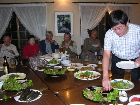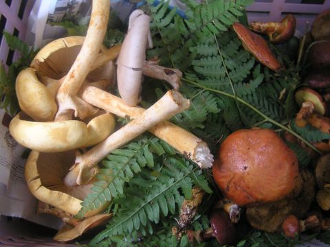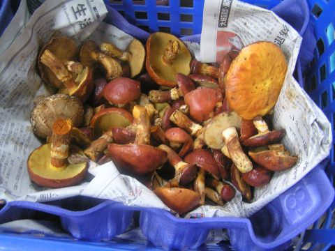 毎年今の時期にグループで見えるキノコ採りのグループのかたがた今回は9人で。朝到着されてすぐ林のほうへ。2時30分頃には驚くほど沢山のキノコをお持ち帰り。今年は夏に雨が多かったから豊作だとの事。早速庭のバーベキューの設備のところで意を燃やしご持参の秋刀魚を塩焼きにしたりきのこも少し焼いて。もちろんお酒も。その後は食堂での夕食のはじまり。お持ち帰りできないようなキノコだけをゆでておろし和えに。東京でのお料理屋さんでの飲み仲間のグループの方たちで若い方から年配の方までで、お話にはながさき楽しい時間が流れます。写真は左からホテイシメジ・ハナイグチ・コガネタケとチャナメツムタケだそうです。