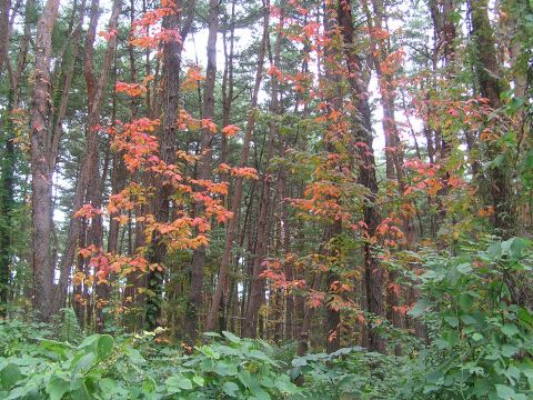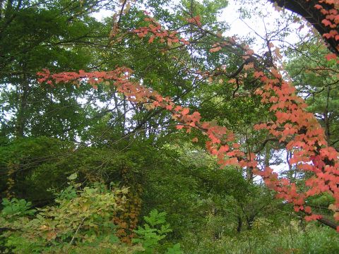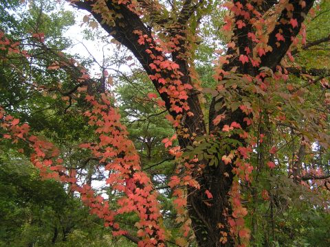 そろそろこの近辺も木に巻きついた漆が鮮やかな色合いを見せはじめました。買い物帰りには又驚くほど見事な色合いを見つけ車を止めました。それは大きな桜の木全体に絡みついたつたの紅葉です。細い桜の枝の先まで巻きついています。こんなに全体に巻きつかれて桜の木は傷まないのかしらと一瞬思いましたが、その色合いの美しさに思わず写真を。