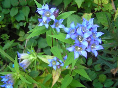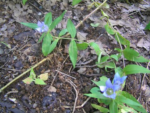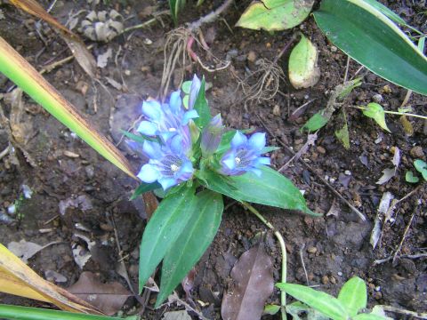ふと気がつくとリンドウが寝転んで咲いていました。日陰のもやしのように花を支える力がないのでしょうか。でも華奢で何ともいとおしい感じです。ご近所の方に蕾の沢山ついたリンドウを頂いて北側に植えましたがこれは見事に咲いてくれました。報告しなければ・・・・・。