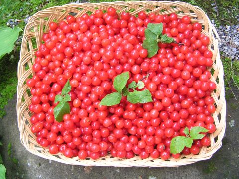 ユスラ梅が採りごろですよとの電話を頂いて雨の降らないうちにとすぐ伺いました。例年のように真っ赤に色づいた実が鈴なりです。今日は、曇ったり晴れたりで、風もあり、それほど暑さも感じないので、仕事がはかどり、沢山摘めました。これがアイスクリームのソースになります。