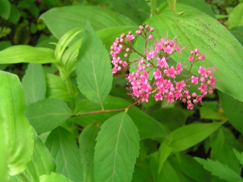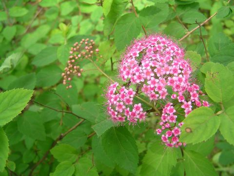 今日も予報によると一日くずれる心配はなさそうです。シモツケが咲き始め色のなかった庭が少し賑やかに・・・。よく見ると花の周りが白っぽくて中心が濃いピンクの花と花の周りもピンクが濃くて中心も濃い花と2種類あります。トリアシショウマが満開になりました。