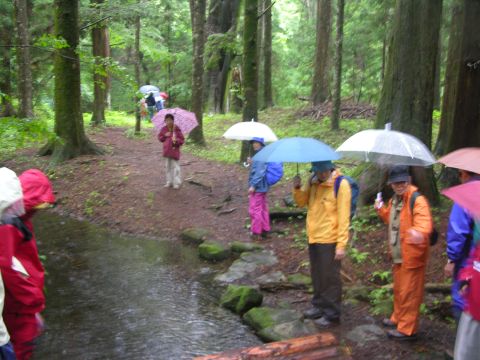 昨夜からの雨がかなり強く降り続いていましたが、いざ出発!!初めての大泉湧水へ。こんな近くにこのような素晴らしい湧水があったなんて信じられない思いです。樹林は比較的明るく風通しもよく幹の太さが100〜540センチもあるクロベという木が17株もそろっていることがこの樹林が貴重とされるいわれだとのことです。クロベという木の名前を聞いたのは初めてという人も多かったようです。