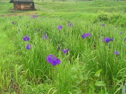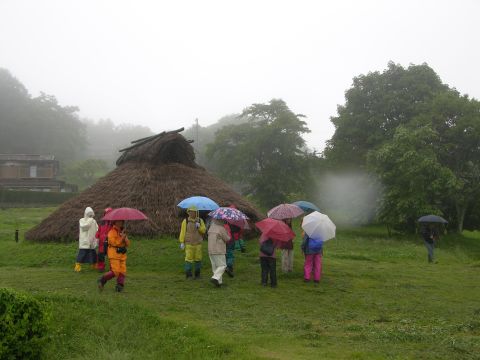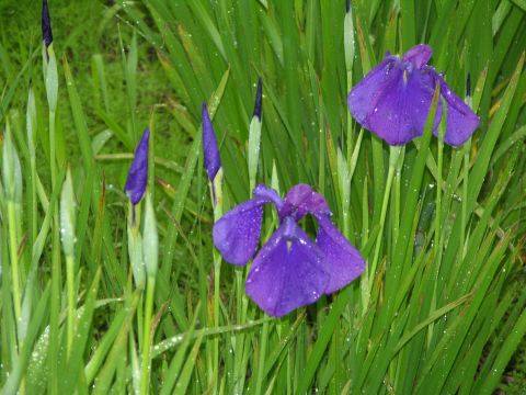 本降りのため短縮コースになり、車で井戸尻遺跡へ。花ショウブが3分咲きで雨の中目を引きました。暫く楽しめるでしょう。