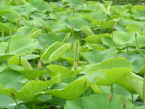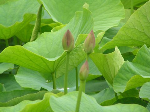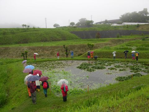 最後に蓮池も覗いて見ました。そろそろつぼみもあがってきていましたが咲くまでには2週間はかかるでしょうか??雨のためハスの葉に雨水がたまり、きらきらと輝いて、小さな水滴は葉の上をコロコロと転がり見ていて飽きない光景でした。なかには、葉っぱをもらって帰り家で遊びたいと言われた方も・・・・。