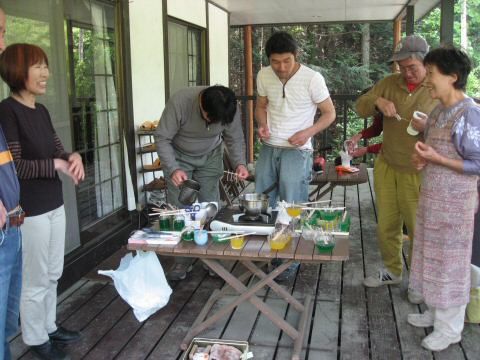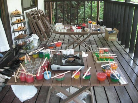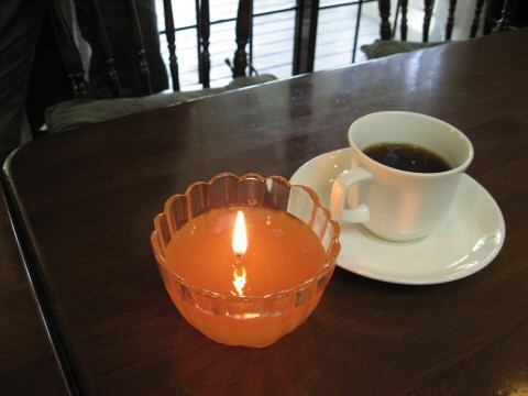お喋りしながら、オレンジ・ブルー・ピンク・ミドリの4色のローソクが思い思いの容器や色合いで出来上がり、あれがいいこれが色合いが暗いだの賑やかに作業が終わり、テイータイム。オレンジ色のキャンドルが暖かくていい感じでした。