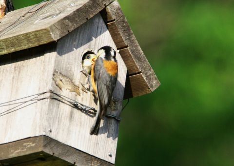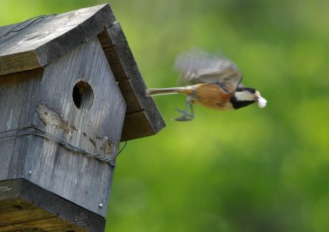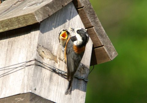 息子から第二便が届きました。親鳥が餌をくわえて巣箱へ帰ってきました。中から雛が大きな口をあけて待っています。次の瞬間雛はしっかり餌を受け止めました。親鳥は巣箱の中のゴミ??? 糞でしょうか??外へ運び出します。綺麗好きなんですね。