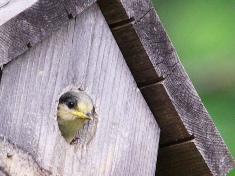 昨日の夕方、一羽の雛が、穴から外を見ていて、近くに親もいなくて呼んでもいないのに、そのまま飛んで近くの木に止まって、どこかへ飛んで行ったそうです。昨夜は雨が降り、気温も下がっていたので心配しましたが、今日巣箱の傍に行ってみましたが雛の声もしないし親鳥も一度も来ないそうで、昨日の内にみんな巣立ったようです。