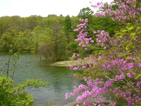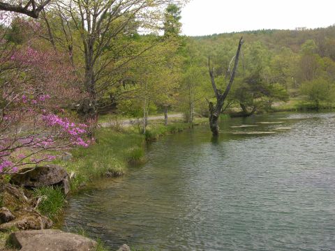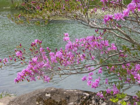 駒出池の方は少し下がるので、淡い緑がさわやかで、明るいピンクの三つ葉ツツジとのコントラストがとてもきれいで神秘的な雰囲気がただよっています。本当に自然はその時々で、さまざまな表情を見せてくれます。