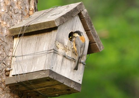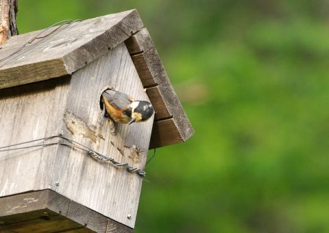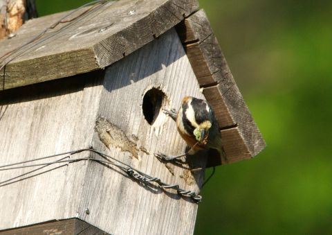 ヤマガラの子育て中の写真第一便が息子から送られてきました。親鳥が青い虫をくわえて帰ってきて、雛にあげています。よく見ると巣箱の中から雛のくちばしがかすかに見えています。さあまた餌を探しに行かなくては・・・・。