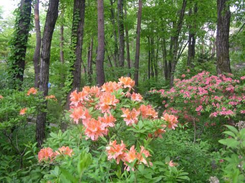 久しぶりの晴れ間で太陽の光がまぶしい感じです。例年あまり咲かないレンゲツツジが思いがけなく花をつけて緑とオレンジ色とのコントラストがとても爽やかです。