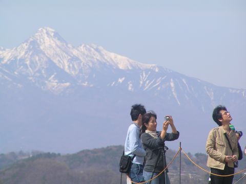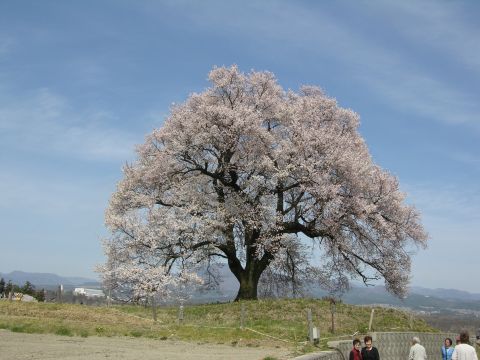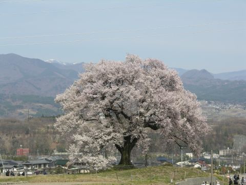 甲府盆地や南アルプスを背景にした大きな1本の桜です。がここも満開。広々とした周りに何もないところにあり、雪を抱いた南アルプス。素晴らしく1枚の絵のようです。