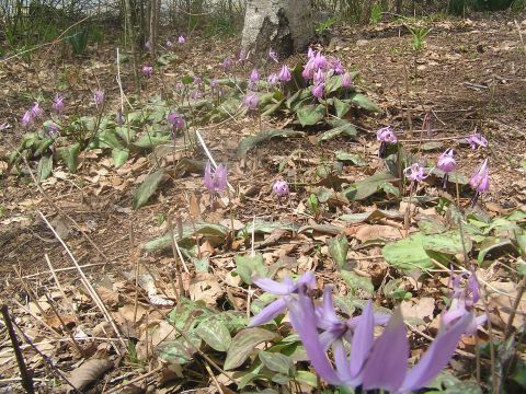 昨日の土砂降りから一転、青く晴れ渡りお出かけ日和。お客様をお送りする途中からの富士山が、雪を抱いて雲がたなびき、なんとも神々しい姿でした。戻ってきて庭を。春先の楽しみで毎日わくわくの連続です。カタクリもこんなに増えてきました。