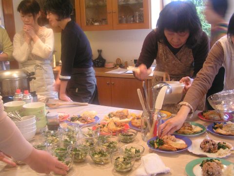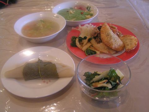 スパゲティヨモギソース・新キャベツとヒヨコマメのスープ・マクロ安心餃子・タンポポのサラダ・菜の花と揚げの辛子和え・つくしの甘酢漬け・桜餅・の7品