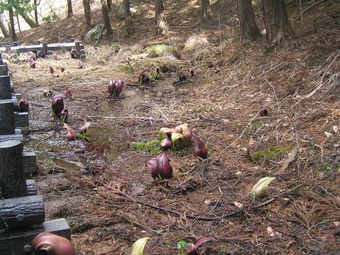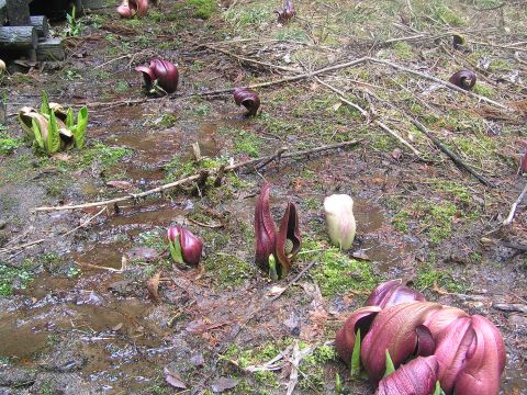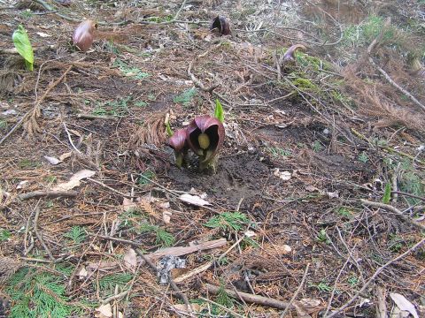 ザゼンソウの群生地があると聞いて行って来ましたが、山の斜面の水の流れがあるところに、広い部分に自生していました。