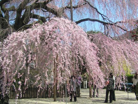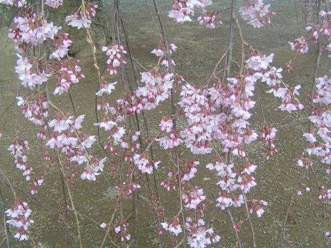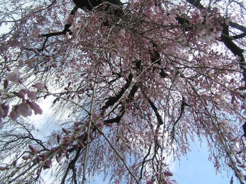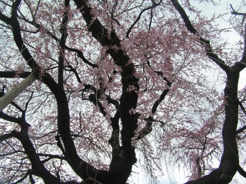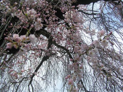 寒い日が続きやっと昨日からの暖かさで、あの憧れのイト桜も少し咲き始めたのではと、行ってみました。思ったより人も少なく、ゆっくり見られました。7,8分咲でしょうか、驚くほど見事で全体が収まりません。太い枝から糸のように垂れ下がった枝はいくつものドームのように咲いていますので花の中にすっぽりはいれて、なんともいえない幸せな気分・・・・。