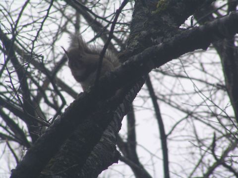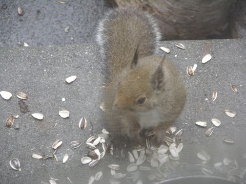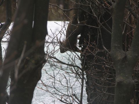 10時過ぎにはみぞれもやんできましたが、2月の気温に。お昼にははれてくるとの予報を期待して・・。庭を眺めていると、珍しくリスが木の上から降りてきて餌場までくるところが撮れました。餌を食べているところはガラス越しなのでちょっと霧がかかっているようですが・・・