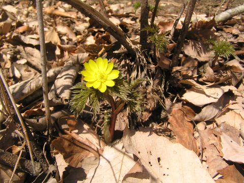 回りには葉芽が驚くほど増えています。これが咲くまでには何年もかかるそうですが・・・・。今年は雪がなかなか溶けなかったためか、庭の福寿草はぜんぜん咲かなくて諦めていたら、道路側の木の根元で小さい花が1本だけ咲いていて、嬉しくなりました。植えたことのない場所なのに・・・。