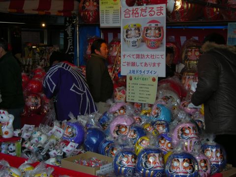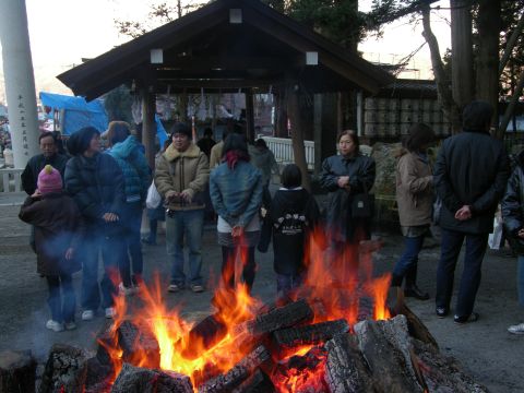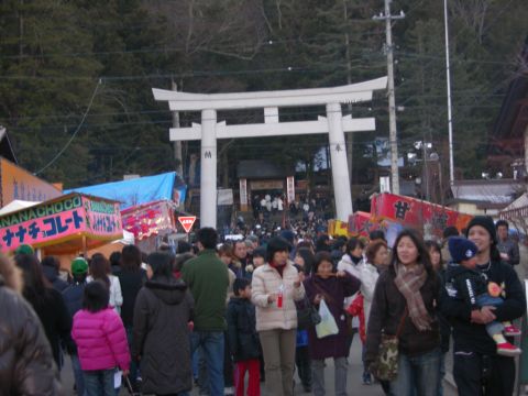 今日も晴れてわりに暖かく初詣日和。案の定ものすごい混雑で車はかなり離れたいくつかの会社が臨時の駐車場になっています。参道は人・人・人・両側には屋台がずらりと並び、混んでいても矢張りこの風景がないと気分が盛り上がりません。お参りを済ませるとかぜが冷たく冷えた体を火の傍で温めます。3分もすれば体全体が温まり、ほっとします。