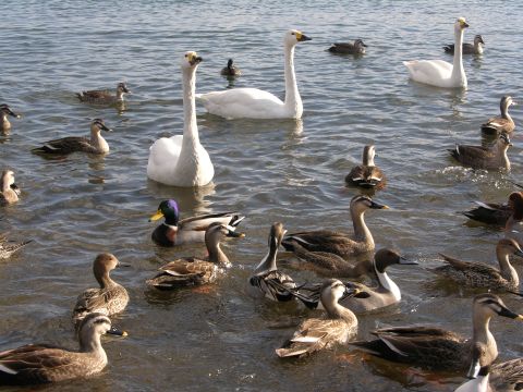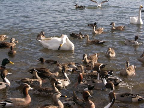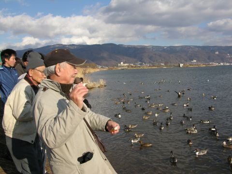 年はじめからの青い空と暖かさはまだ続いていて、穏やかな日です。弟夫婦と一緒に諏訪湖の水鳥を見に行きました。大勢の人でにぎわっていました。それぞれの人がパンをちぎって投げています。私達も投げますが、すばしっこくて要領のいい鳥はいつもぱんをとりますが、白鳥は首が長いからか、おっとりしているからか、なかなかパンが取れません。周りの人たちも白鳥にあげたくて、パンを投げるのですがうまくいきません。こんなに沢山の鳥をまじかに見ていると楽しくて、可愛くて、時のたつのを忘れてしまいそうです。