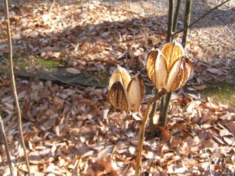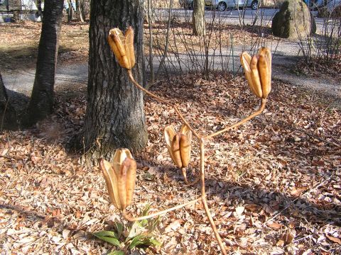 事務仕事に疲れ庭に出てみると、風もなく穏やかで暖か。冬枯れの庭もなかなか面白い。前の道路からは丸見え!!・・・・。地面は、厚い落ち葉の布団に覆われて、春を待つ虫や山野草が冬眠しているのでしょう。ユリやオオウバユリの種が詰まっていた殻がたち枯れたまま・・・・で全体がセピア色の世界で綺麗です。