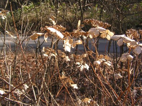 アジサイの花も咲いたまま立ち枯れたものも、ドライフラワーのようになっています。白い山吹の種もついているもの。レンゲツツジの花のあともついたままのものも。
