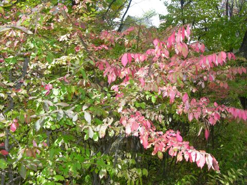 朝から少し風が吹いて、カツン、コロンと木の実が落ちる音や、落ち葉の舞い散る音が静かな林に響きます。遅ればせながら庭の紅葉も始まりました。ニシキギやカエデ、ダンコウバイなど、すでに桜はちりちりと散っています。
