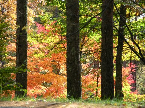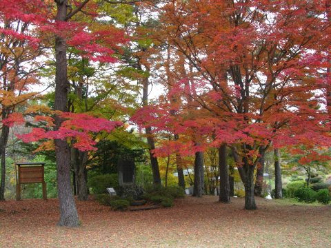 トチの木風除林、随所に置かれている馬頭観音像、原の茶屋跡を通り紅葉が真っ盛りの富士見公園、最高です。感激です。仲間のスタッフが運んでくれた弁当に舌打ち、暫し呆然、同じ場所を思わず何回もシャッターをきる。次行くところは、犬養毅様が大正13年に別荘をお造りに成った庭園、別世界の浮世はなれた雰囲気、素晴らしい紅葉にまたまた感激、現在は富士見高原病院が管理して入園の許可が必要とか、