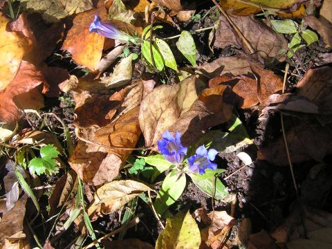 今日は暦の上では立冬ですが、暖かく穏やかな小春日和です。庭には、最後の花が咲いています。落ち葉の中にリンドウ・リュウノウギク・ノコンギクです。暖かな日差しを浴びて気持ちよさそうです。