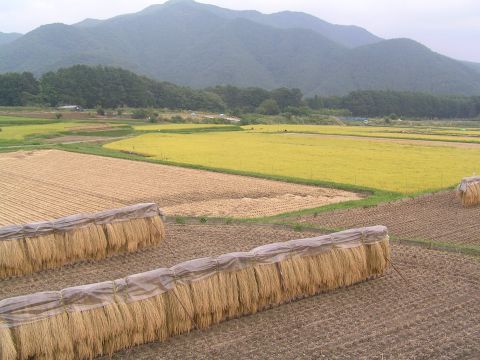 刈り取られた稲が干されている横では、まだ、金色に輝く稲穂が風に揺れていて、そのコントラストが、あまりにも綺麗で、写真に撮りましたが、その近くでは、案山子コンテストをやっていました。