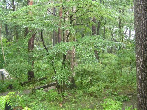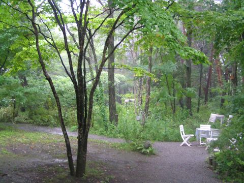 テレビでは各地の台風状況が映し出されていますが、小淵沢は朝から曇りで午後から雨模様、強くなったり、小雨になったり、風が強くなったりという程度で、いつものことながら、被害のないところです。雨で洗われた庭の緑がとても綺麗でした。