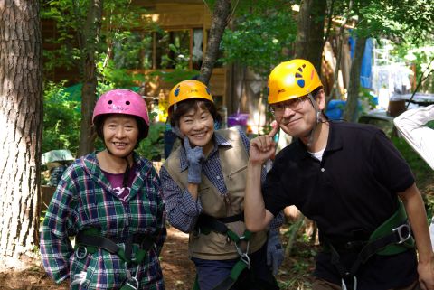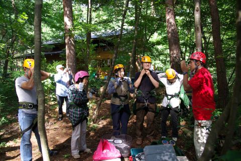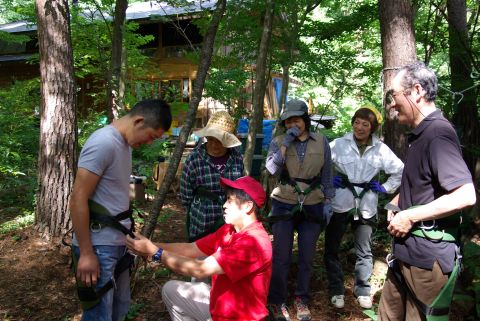 新聞やテレビで見てやってみたいと思っていたと思っていたツリークライミングをやっと体験することが出来ました。まずインストラクターの懇切丁寧な説明を受けて、みんな少し緊張気味で装具をつけています。