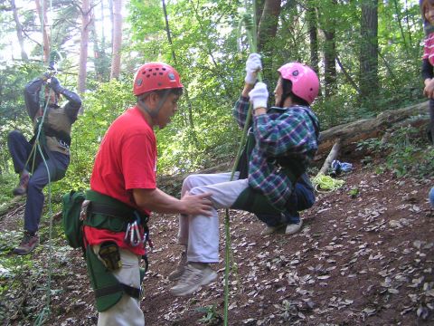 いよいよ順番に登り始めることに。足が地上を離れます。少しずつ少しずつ上に。自分で操作をしながら上へ。途中であれ???どうだっけ??説明を聞いていたときは、わかった!!わかった!!と思っていたのに・・・。でも両手を離しても絶対落ちないとわかっているので安心!!しばし一休み。また上り始めやっと上まで。体が宙に浮いているのがこんなに気持ちのいいものだとは・・・。今は、木の葉が茂っているけど、これが落ちたころは、素晴らしい眺めだろうと想像しながらしばし休憩。降りるときはインストラクターに下でロープを持っていただいてゆっくりとおりてきました。また、登ってみたいなと思いながら・・・。体験したいと思われる方は何日かまえの予約が必要とのことです。