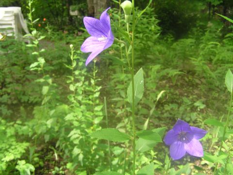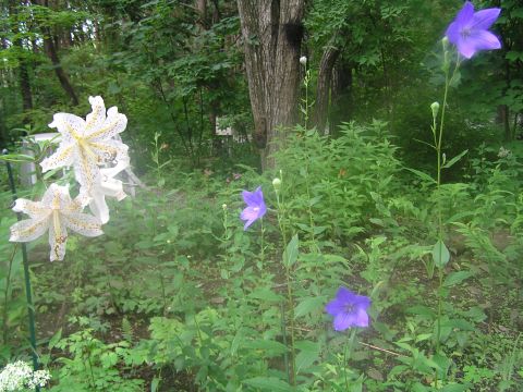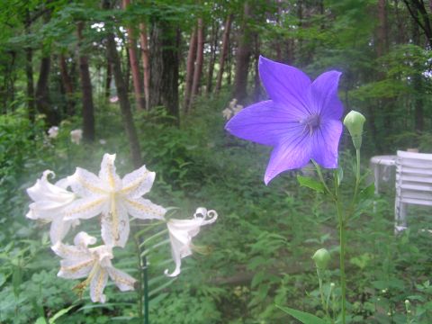 キキョウが咲き始めました。隣の山百合に負けないようにと背伸びして咲いて白と青とのコントラストがとてもきれいです。