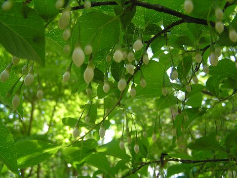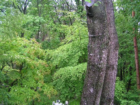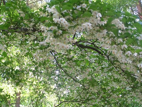 この間芽吹きが始まったと思ったらもうこんなに深くなってきました。ヤマボウシの花もいつの間にか咲いています。木が大きくなって花も下からは見にくくなってきました。陽当たりが悪くなったせいか、花のつきも悪いようです。周りから見るとこんもりと森のようになって少し枝を切らなければ。
