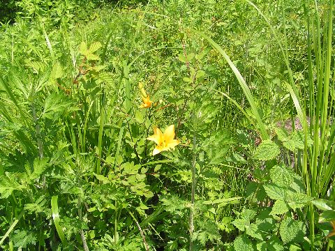 9時半現地集合。植林されたカラマツも大分延び、草の背丈も延びて、随分風情が変わったようです。緑の中にニッコウキスゲが鮮やかに咲いていました。ケブカツルカコソウも昨年は群生で咲いていましたが、今年は彼方此方で5〜10株くらいがかたまって咲いていました。