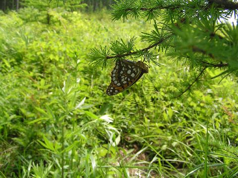 観察地で唐松の枝に蝶がとまっていました。人がそばを通り写真を撮っても動きません。蝶を手にとって、図鑑の写真と比べてヒョウモンチョウだと教えて頂きました。そのまま蝶をとまっていた枝に、戻されると、その枝で羽を広げ、カメラを構えたときはひらひらと、飛んで行きました。体を温めていたのだそうです。こんな情景は始めてみました。