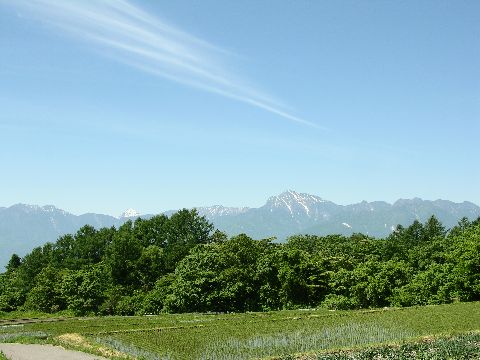 朝の気温は16度、東京は真夏日なのにすずしくて気持ちがいいですねとお客様。今日も又青空が・・・。6月なのにこんなに綺麗な田園風景が撮れました。朝もっと早ければ、もっと、もっと綺麗な山の写真が撮れたかもと思いながら・・・・。