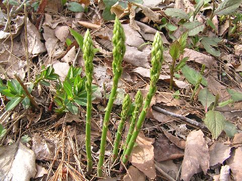 ニリンソウも蕾が大分出てきました。彼方此方にとんでいますが矢張り随分差があるようです。シュンランも今年は成績が悪いようで、2カ所位より咲いていません。その近くには、ヤマノアスパラが昨年より少し太いのが出ていました。
