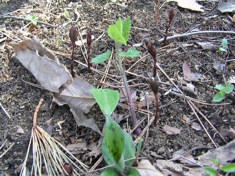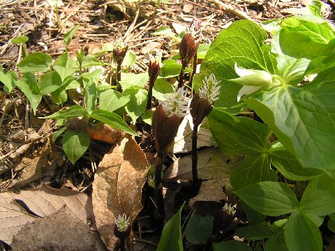 ヒトリシズカも少し顔を出し始めました。真だほんの蕾ですが・・・。一カ所では賑やかに出てきています。今11時で気温は4度とだいぶ冷え込んでいます。今カラ松も芽吹きはじめ、いろいろな木々の若芽も柔らかく季節の移り変わりは素晴らしい自然を見せてくれます。