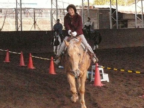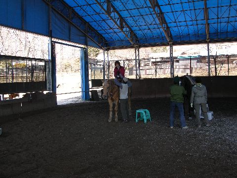 2日目で並足は大分馴れましたが早足になると、馬の動きになかなか併せられない。たまに馬の動きにあったときはスゴクラク〜〜〜。でもこれは長くは続かない。すぐにお尻はドスンと鞍の上に落ちる。お尻がいた〜〜い。でも、外場が出来るまでは頑張らなくては・・・。でも、写して貰った写真は昨日と違い笑顔のものもありました。今度は9日が3日めで習ったことを忘れないようにしなければ。