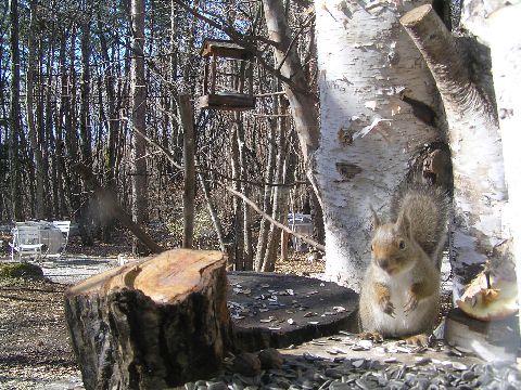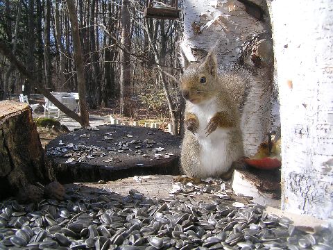 毎日決まってやって来ますが、その仕草があまりに可愛いので、ついシャッターを押してしまいます。まるでピーターラッビト君のようです。先ずヒマワリをむしゃむしゃ長い時間食べてバターをなめて、リンゴをかじります。その間小鳥たちも入れ替わり立ち替わりやってきま簀が同じ画面で撮るのは難しいものでなかなか撮ることができません。リス君の方はガラスにカメラをくっつけても、ガラスの所に5人カメラマンが並んでも逃げなくなりました。食事が終わると木の枝を伝ってお帰りです。写真はふさふさしっぽが光線の具合で見にくいですが・・・・。