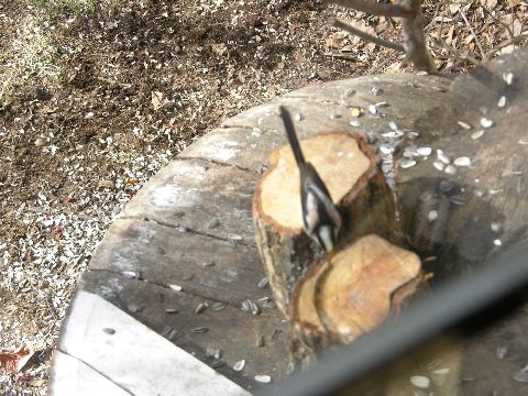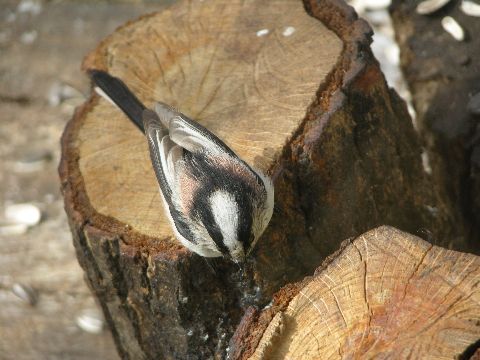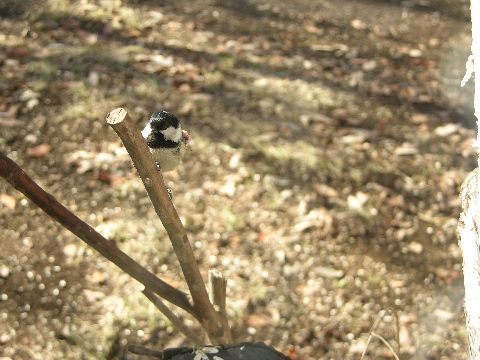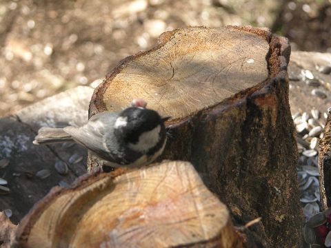 庭に来るコガラの左の肩の当たりに、直径5ミリ位の丸い、綺麗なピンク色の突起物が出ていました。ビックリして、よく見ようとしてもすぐ移動してしまうので、ジックリは見られませんが、体内からのモノのようですが・・・・・・。具合が悪そうではなく、元気にヒマワリを食べたり、木と木の間に首をつっこんでバターをつついています。日に何回も来ますので姿を見るとなんだか、あっ!!元気だね!!とほっとします。