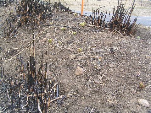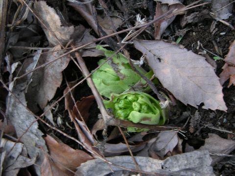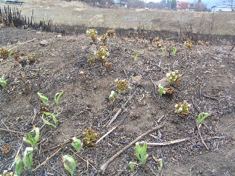 蕗の薹の群生を見付けたのですが、野焼きの後で出てきたらしく、ほとんどが焼け焦げていました。もったいない!! とても残念です・・・・が、又来年を楽しみにしましょう。