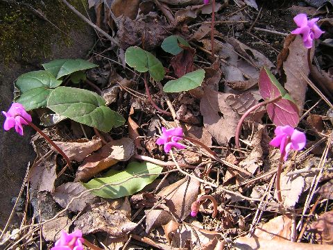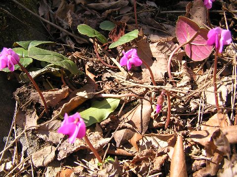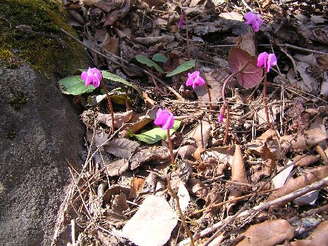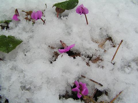 シクラメンが咲き始めました。一昨年は真っ白な雪の中で咲いて、感激しましたが昨年は−15度になり一輪も咲きませんでしたので、枯れてしまったのかと諦めていたのですが、半分くらいは生き残っていたようです。枯れ葉の中で咲いています。