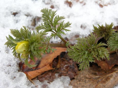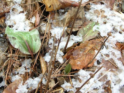 今朝、矢っ張り雪。一面うっすら。雨に変わり凄い勢いで、ぽたぽたと溶け始めていました。慌ててカメラを持って庭に出て何とか解ける前に撮ることが出来ましたがカゼが強く、シャッターを切る手が凍えそうでした。雪の中の福寿草・シクラメン・カタクリの葉は、又風情が違いますね。今年は雪が少なく、寒い冬を待って、待ってやっと春が来るという待つ楽しみ??がなかった??